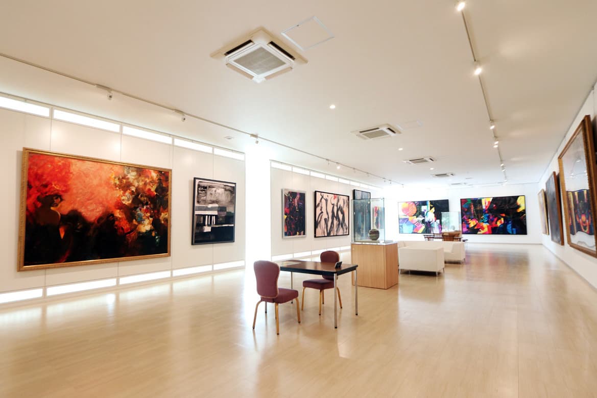 日本画、洋画、陶磁器のほか、銅版画、アートロボット、漫画など多様な作品が展示。ゆっくりと作品を鑑賞することができます。